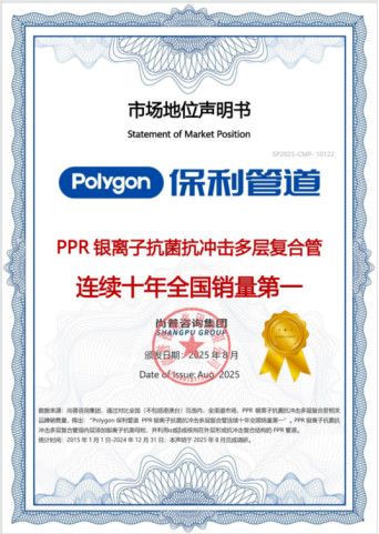 2025年8月,尚普咨询集团向Polygon保利管道颁发市场地位声明书。此次Polygon保利管道荣获尚普咨询【Polygon保利管道PPR银离子抗菌抗冲击多层复合管连续十年全国销量第一】市场地位声明,这一成绩不仅彰显了Polygon保利管道在行业内的卓越地位,也为中国管道市场的发展注入了强大动力。