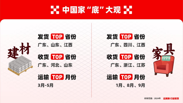 行业数观显示,中国建材与家具运输呈现出明显的季节性特征和地域性特色。在建材运输方面,全年运输高峰集中在3月到5月,这与中国建筑行业的施工周期密切相关。广东、山东、江西是发货量最大的三个省份,而广东、河北、山东则成为接收建材最多的地区。