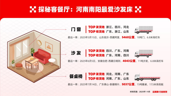 被誉为“中国家具之都”的广东,在沙发、餐桌椅两品类中均在发货TOP省份之列。其中最远的一单餐桌椅于7月14日由广东佛山运往新疆喀什,运输距离超过5000公里。有趣的是,河南南阳是今年前三季度沙发床收货量最大的省份,南阳人被评为“最会在客厅躺平的人”。