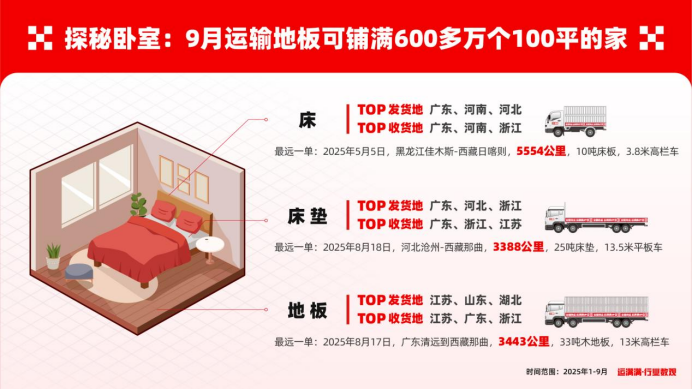 运满满行业数观显示,仅9月一个月,通过运满满平台运输的地板面积就可铺满600多万个100平方米的家,这一数据充分展现了中国家居市场的庞大规模。今年以来最远的一单地板,在8月17日这天,由广东清远发往了西藏那曲,长途跋涉走过了3000多公里路。