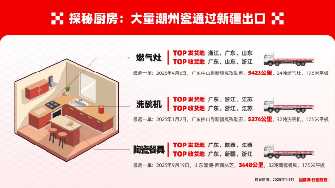 燃气灶、洗碗机的TOP收发货地主要集中在广东、浙江、江苏三地。与客厅、卧室空间家具最远一单车型分散不同的是,厨房家具最远一单均由17.5米平板车承运,这也是货车里体型最大的“老大哥”。