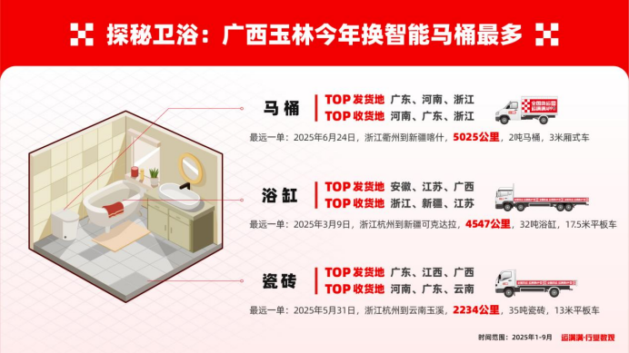 卫浴空间则呈现出消费升级的明显趋势。根据运满满平台同比涨幅看,广西玉林、河南郑州、浙江丽水成为今年更换智能马桶最多的城市。